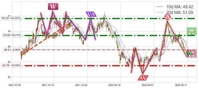 ♘ 阻力价格位53.69,可信任强度86.55%,距离最后交易2022-08-12形成的收盘价格48.94相差 +9.71%