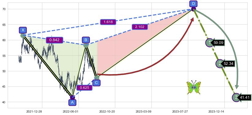 ➣ 未完成【蝴蝶】形态起点X: 2021-10-14, 已到达C点: 2022-08-10, 预测最终D点: 2023-08-17, 共469交易日