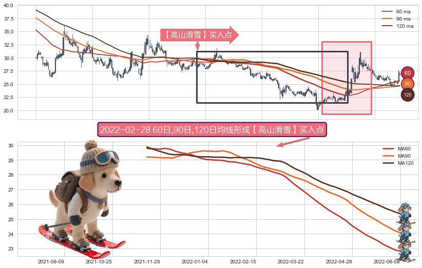 ⚀ 2021-11-18日-2022-06-08日显现 60日-90日-120日均线 【高山滑雪】买入点 看多信号,后市看涨,买入