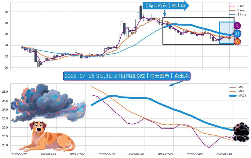 ⚀ 2022-07-07日-2022-08-11日显现 3日-8日-21日均线 【乌云密布】卖出点 看空信号,后市看跌,卖出