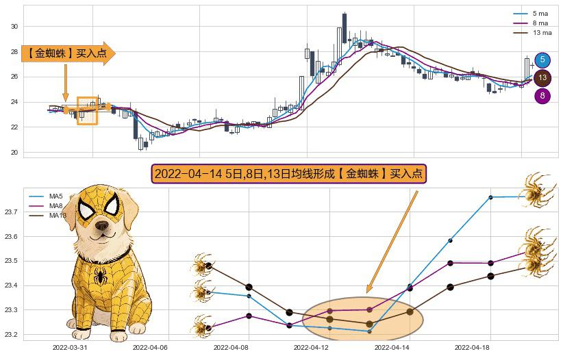 ⚀ 2022-04-14日显现 5日-8日-13日均线 【金蜘蛛】买入点 看多信号,后市看涨,买入