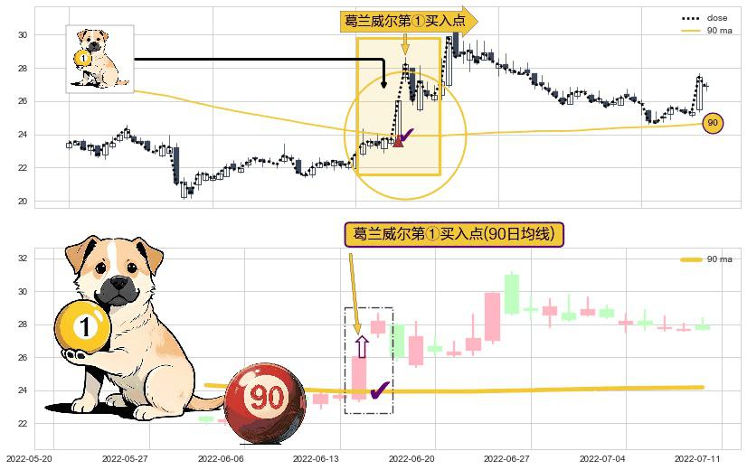 ⚀ 2022-06-14-日显现 葛兰威尔均线 90日均线 第买①入点 走势反转见底信号,后市看涨,买进信号