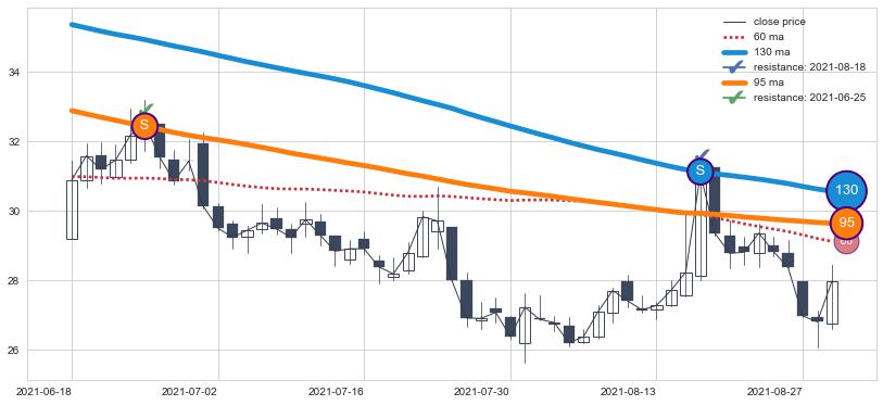 ⚁ MA3和MA8走势平行,且始终保持在短距离内,MA21始终在短中期均线上方,与短中期均线保持一定的距离,微微下行