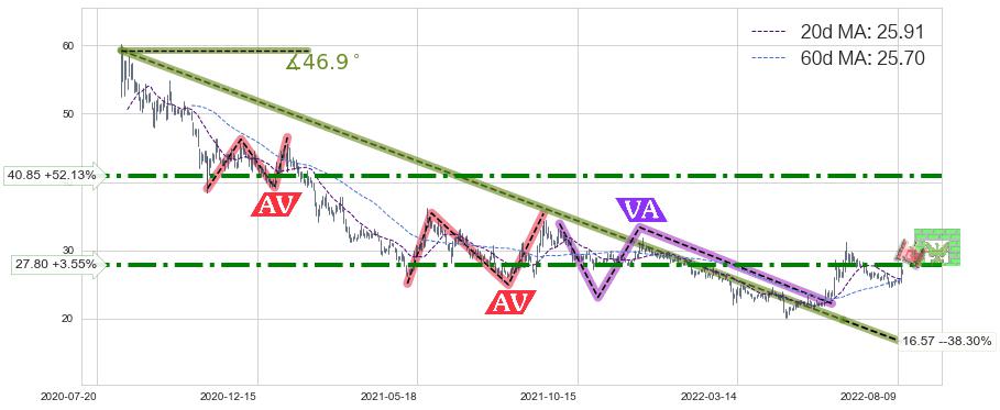 ♘ 阻力价格位27.80,可信任强度79.78%,距离最后交易2022-08-12形成的收盘价格26.85相差 +3.55%