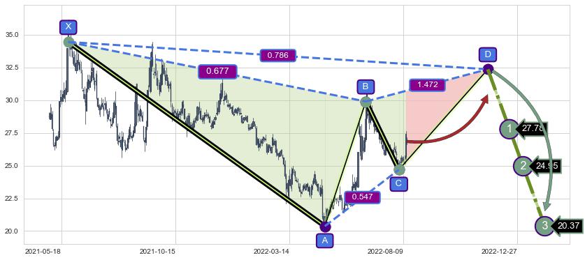 ➣ D点拟合预测价格32.36,距离最后交易收盘价格26.85相差 +20.53%