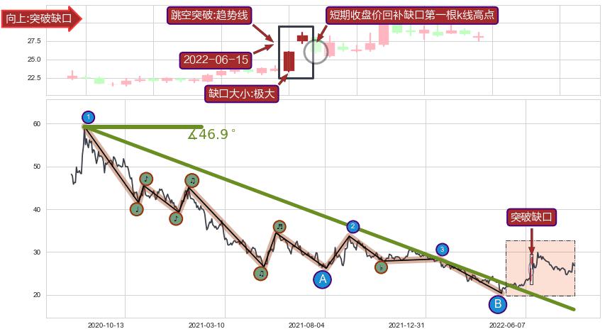 ➣ 2020-08-10-2022-06-22下跌趋势存在反转上涨[机会],其原下跌趋势的阻力位(16.57)已被突破[强支撑信号],原下跌趋势角度: 46.9˚