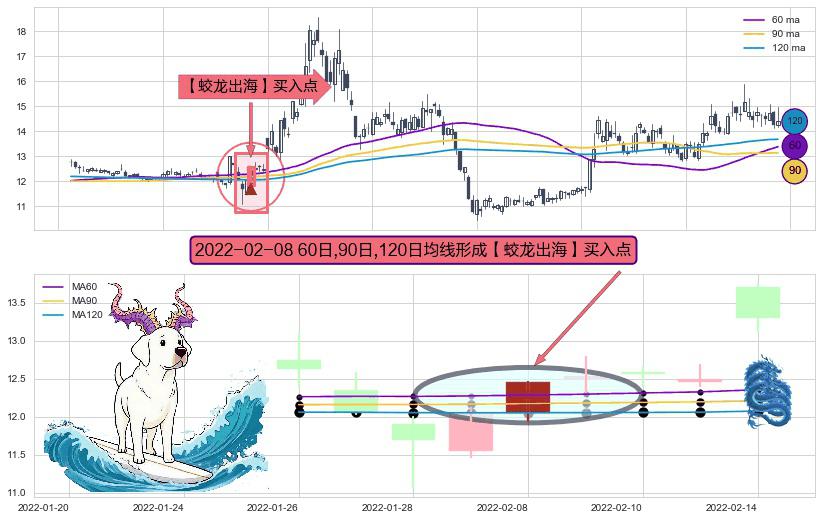 ⚀ 2022-02-08日显现 60日-90日-120日均线 【蛟龙出海】买入点 看多信号,后市看涨,买入