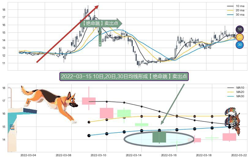 ⚀ 2022-03-15日显现 10日-20日-30日均线 【绝命跳】卖出点 看空信号,后市看跌,卖出