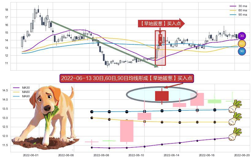 ⚀ 2022-06-13日显现 30日-60日-90日均线 【旱地拔葱】买入点 看多信号,后市看涨,买入