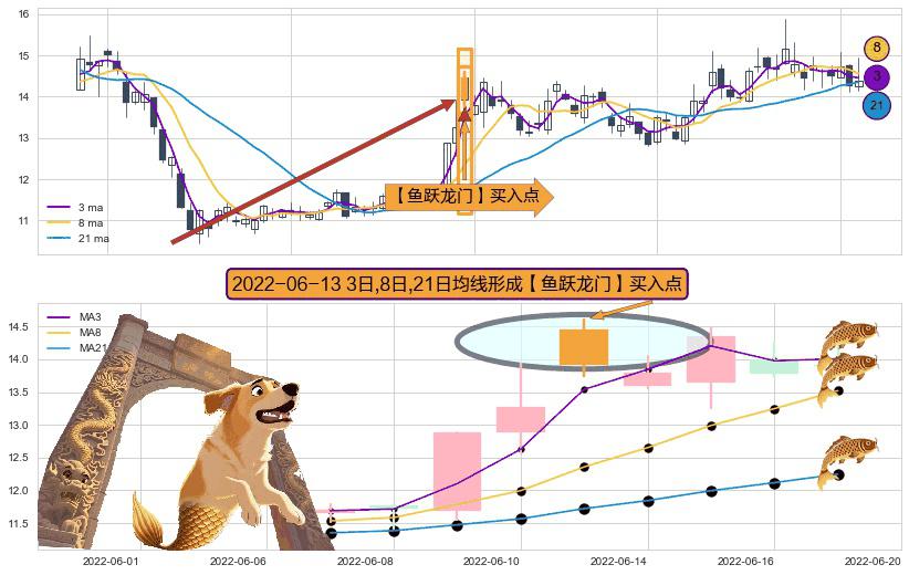 ⚀ 2022-06-13日显现 3日-8日-21日均线 【鱼跃龙门】买入点 看多信号,后市看涨,买入