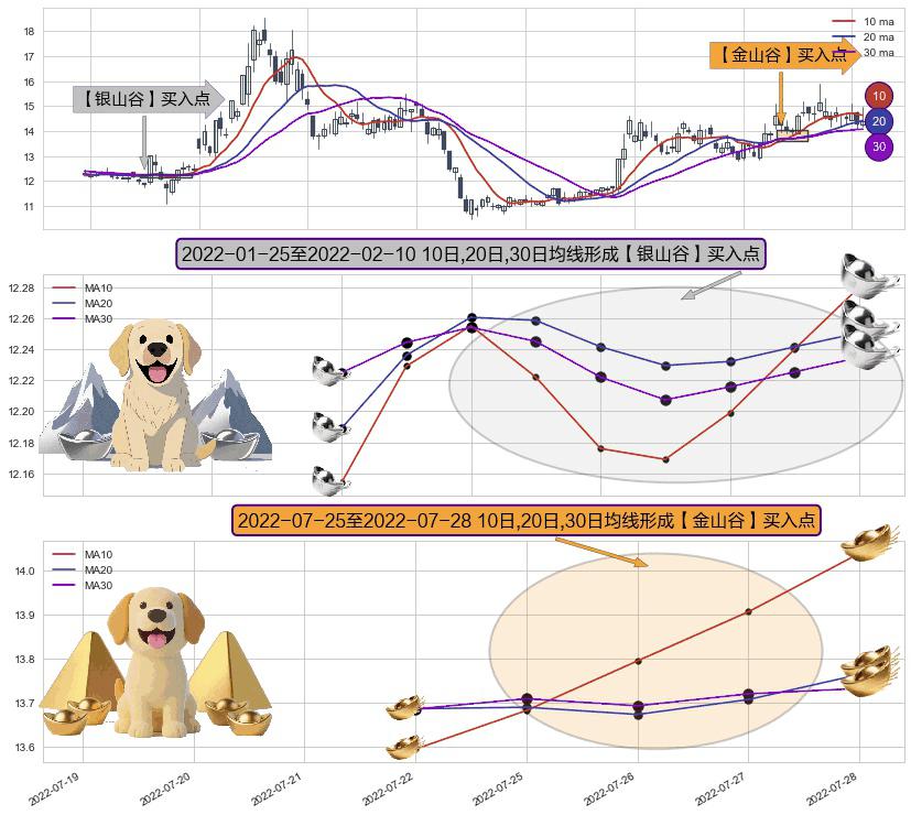 ⚃ 2022-07-26-日至2022-07-28-日显现 10日-20日-30日均线 【金山谷】买入点 其再次确认了买入信号,可靠性更强,买入
