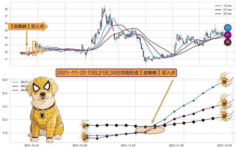 ⚀ 2021-11-23日显现 13日-21日-34日均线 【金蜘蛛】买入点 看多信号,后市看涨,买入