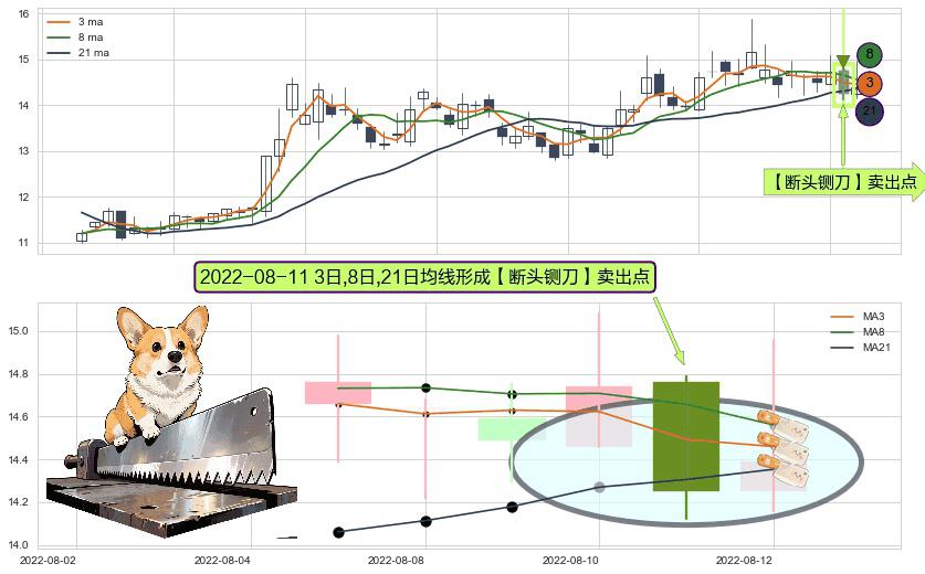 ⚀ 2022-08-11日显现 3日-8日-21日均线 【断头铡刀】卖出点 看空信号,后市看跌,卖出