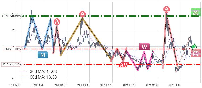 ♘ 支撑价格位13.70,可信任强度64.05%,距离最后交易2022-08-12形成的收盘价格14.39相差 -4.81%