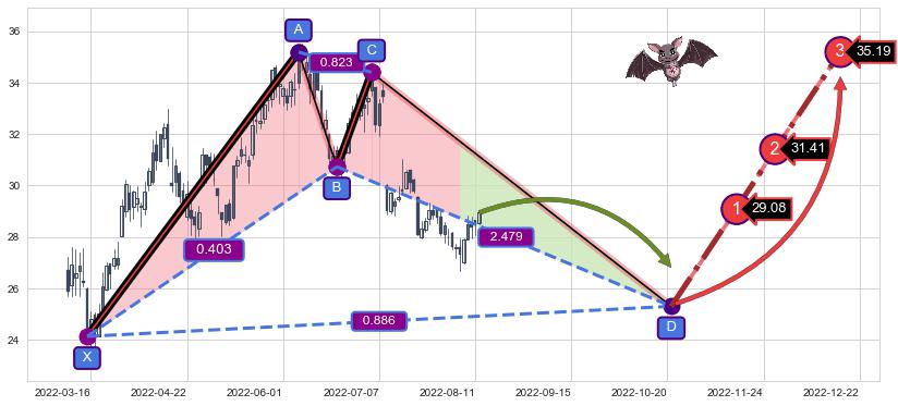 ➣ 未完成【蝙蝠】形态起点X: 2022-03-15, 已到达C点: 2022-07-05, 预测最终D点: 2022-10-21, 共148交易日