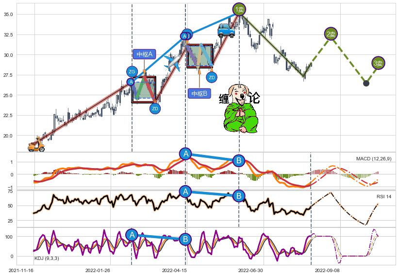 ➣ 【中枢B】:2022-04-15-2022-05-12,中枢由4笔构成,共17交易日, ZG=31.03, ZD=28.64