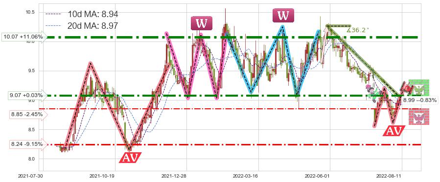 ➢ 【已确认突破】最后价格:9.07与最小【整理】第一目标价格→(2022-08-18: 8.56 )相较: 下跌空间【较小】