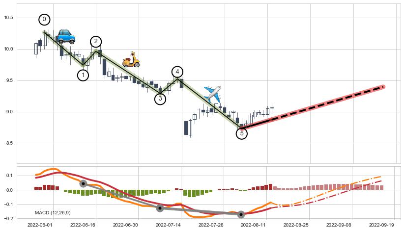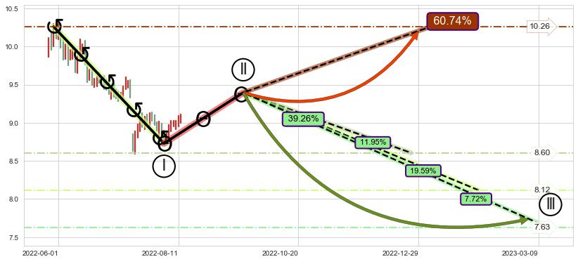 ➢ 循环浪继续向下【最高】位置(2022-12-26, 8.60),匹配聚类样本比例30.43%, 可能性概率11.95%