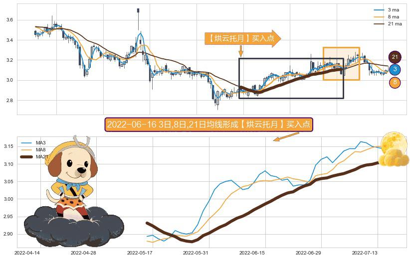 形态多维评估: ⚀ 2022-05-16日-2022-07-15日显现 3日-8日-21日均线 【烘云托月】买入点 看多信号,后市看涨,买入