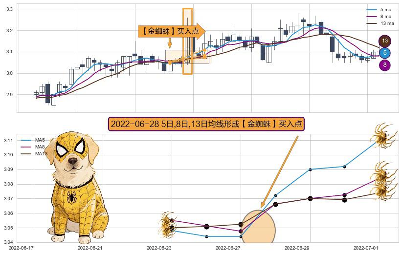 形态多维评估: ⚀ 2022-06-28日显现 5日-8日-13日均线 【金蜘蛛】买入点 看多信号,后市看涨,买入