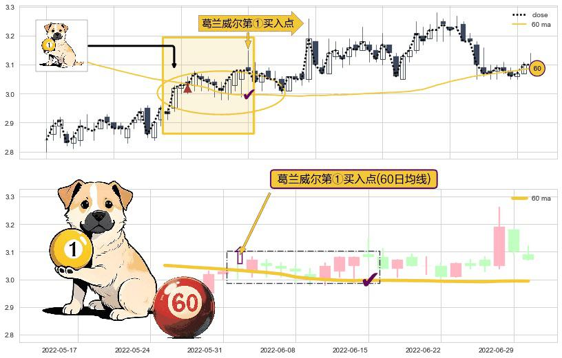 形态多维评估: ⚀ 2022-06-01-日显现 葛兰威尔均线 60日均线 第买①入点 走势反转见底信号,后市看涨,买进信号