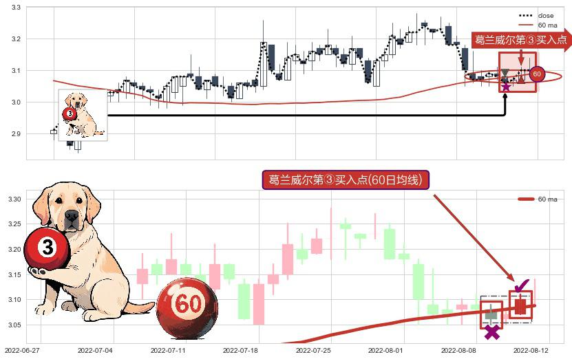 形态多维评估: ⚀ 2022-08-11-日显现 葛兰威尔均线 60日均线 第③买入点 上升趋势的中继信号,后市看涨,买进信号