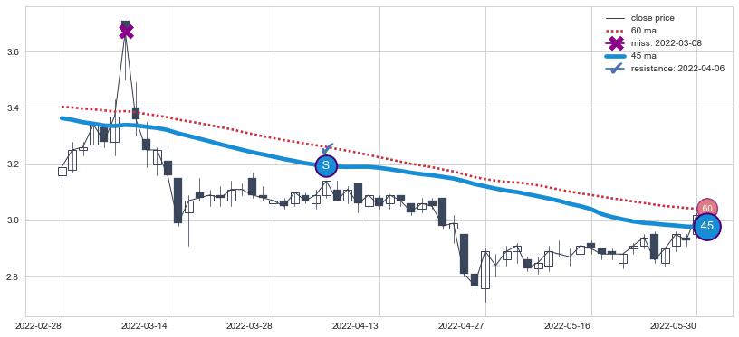 下跌趋势2022-02-28-2022-05-30,均线45确认关键阻力1处