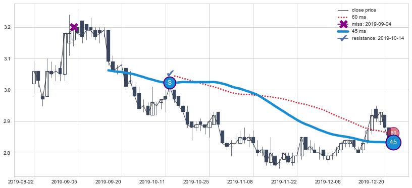 下跌趋势2019-08-22-2019-12-23,均线45确认关键阻力1处