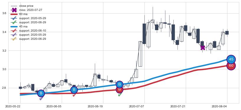 上涨趋势2020-05-22-2020-08-04,均线60, 45确认关键支撑3处