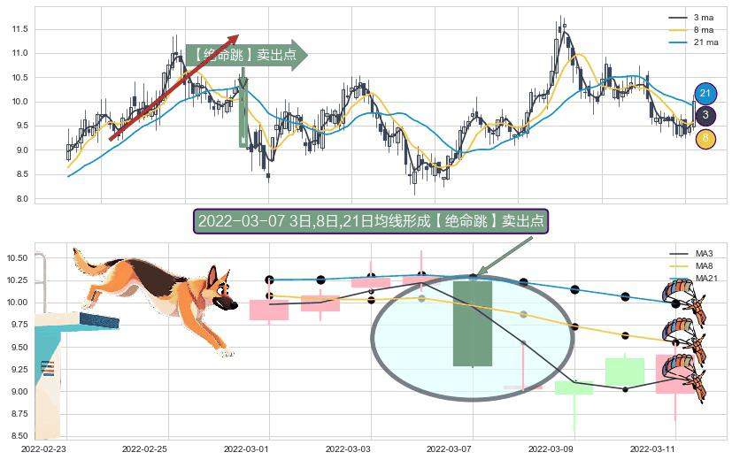 形态多维评估: ⚀ 2022-03-07日显现 3日-8日-21日均线 【绝命跳】卖出点 看空信号,后市看跌,卖出