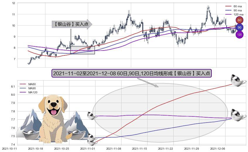 形态多维评估: ⚀ 2021-11-03-日至2021-12-08-日显现 60日-90日-120日均线 【银山谷】买入点 看多信号,后市看涨,买入