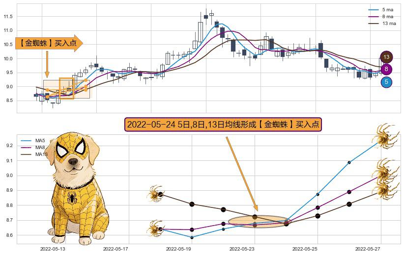 形态多维评估: ⚀ 2022-05-24日显现 5日-8日-13日均线 【金蜘蛛】买入点 看多信号,后市看涨,买入