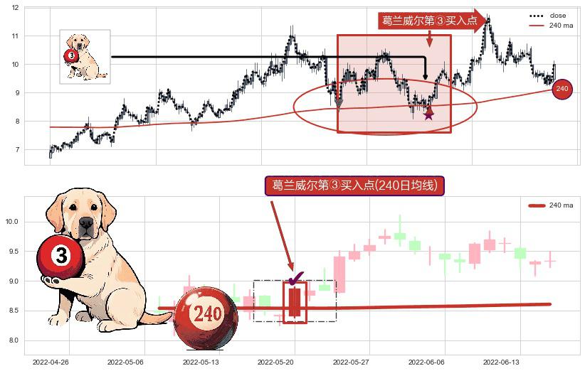 形态多维评估: ⚀ 2022-05-20-日显现 葛兰威尔均线 240日均线 第③买入点 上升趋势的中继信号,后市看涨,买进信号