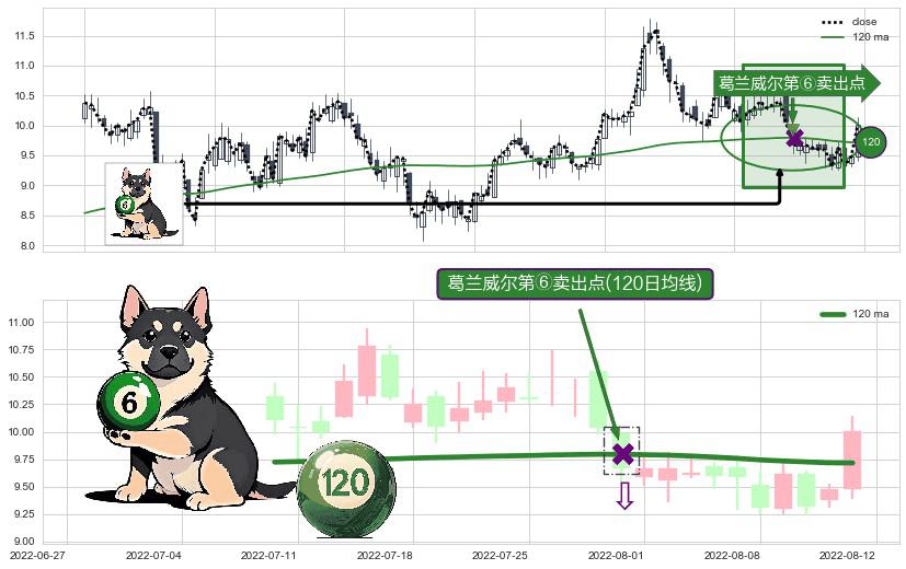 形态多维评估: ⚀ 2022-07-29-日显现 葛兰威尔均线 120日均线 第⑥卖出点 走势反转见顶信号,后市看跌,卖出信号