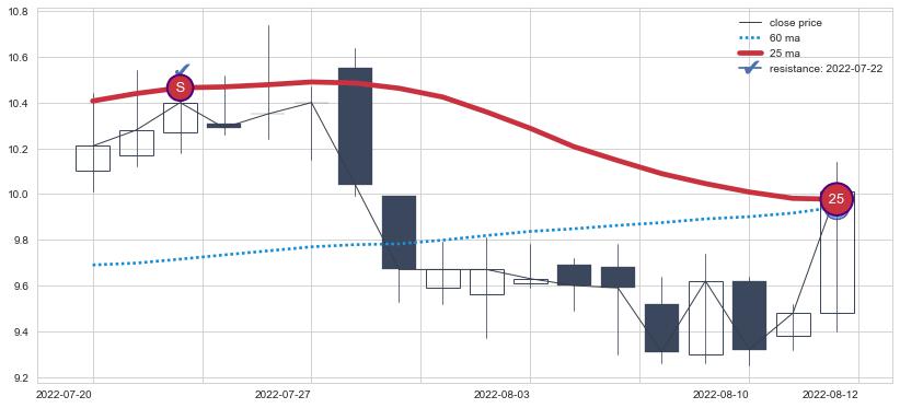 下跌趋势2022-07-20-2022-08-12,均线25确认关键阻力1处