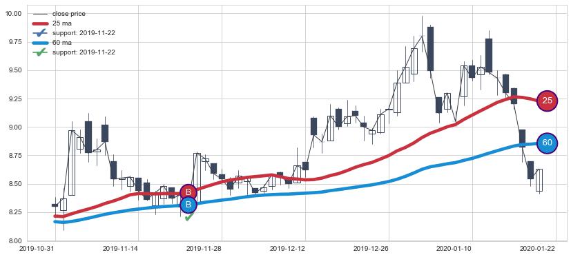 上涨趋势2019-10-31-2020-01-22,均线25, 60确认关键支撑1处