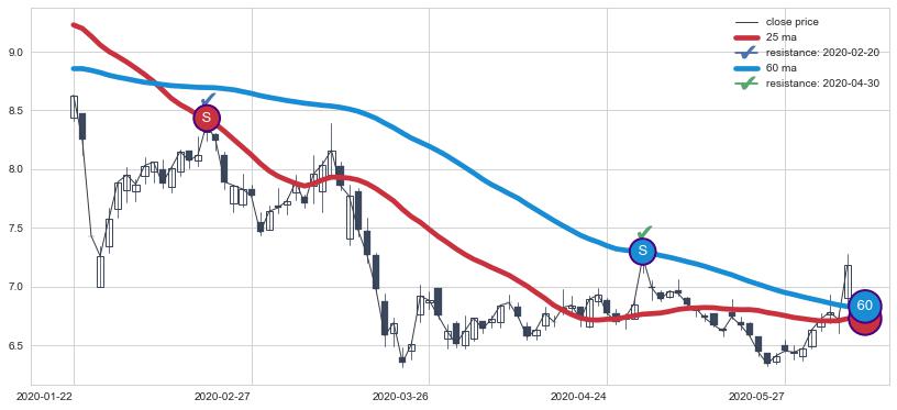 下跌趋势2020-01-22-2020-06-05,均线25, 60确认关键阻力2处