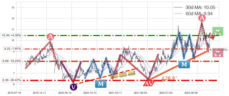 ♘ 阻力价格位10.44,可信任强度70.67%,距离最后交易2022-08-12形成的收盘价格10.01相差 +4.30%