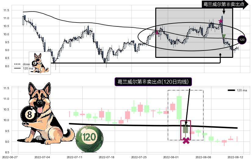 ⚀ 2022-08-02-日显现 葛兰威尔均线 120日均线 第⑧卖出点 下降趋势的中继信号,后市看跌,卖出信号