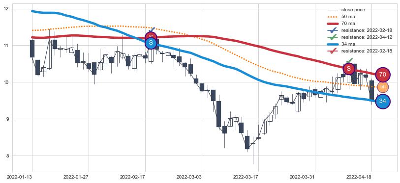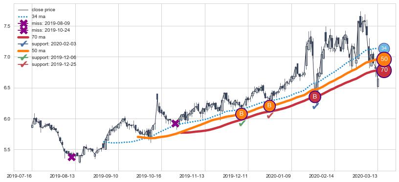 ➢ 最优均线组合共正确确认支撑阻力信号7处,正确确认率 70.00%