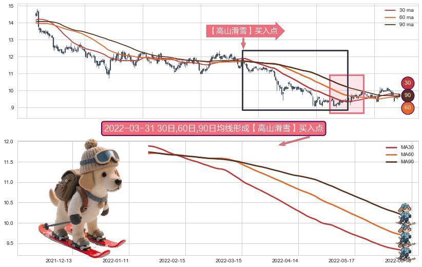 ⚀ 2022-01-20日-2022-06-09日显现 30日-60日-90日均线 【高山滑雪】买入点 看多信号,后市看涨,买入