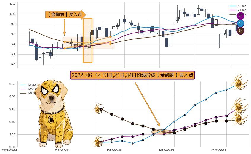 ⚀ 2022-06-14日显现 13日-21日-34日均线 【金蜘蛛】买入点 看多信号,后市看涨,买入