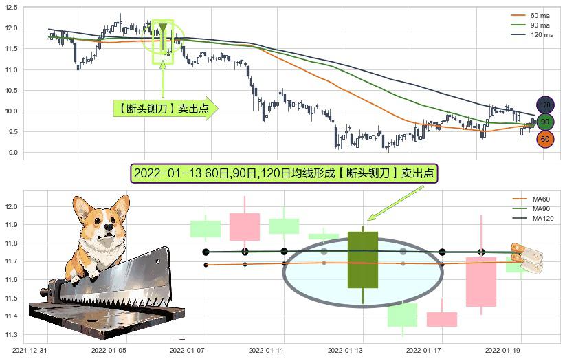 ⚀ 2022-01-13日显现 60日-90日-120日均线 【断头铡刀】卖出点 看空信号,后市看跌,卖出
