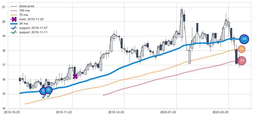⚅ 卖点向下突破均线后,价格走势有持续向下的迹象,但动能稍显不足,迟迟不能远离均线