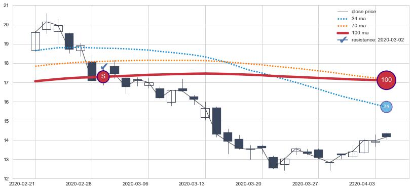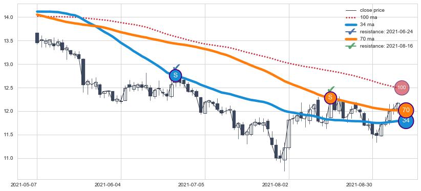 ⚀ 中期均线MA21上穿长期均线MA34形成的交叉是标准 黄金交叉