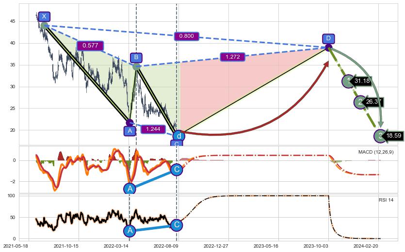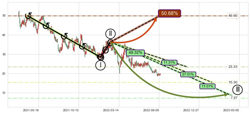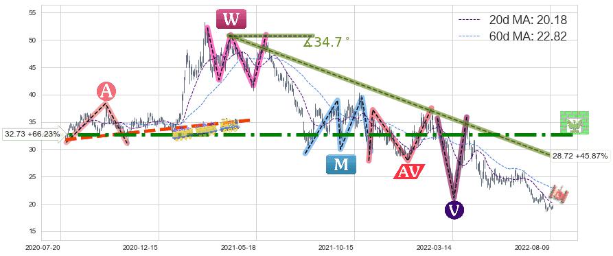 ➣ D点拟合预测价格38.95,距离最后交易收盘价格19.69相差 +97.84%