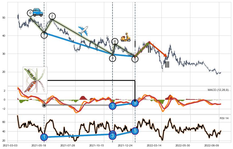 ➢ 第一, 三驱动浪端点:【RSI】走势出现【常规背离 & 反转信号】背离程度16.71%,背离夹角角度52.3˚,背离程度较小