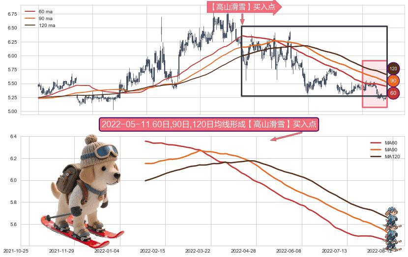 ⚀ 2022-01-24日-2022-08-12日显现 60日-90日-120日均线 【高山滑雪】买入点 看多信号,后市看涨,买入
