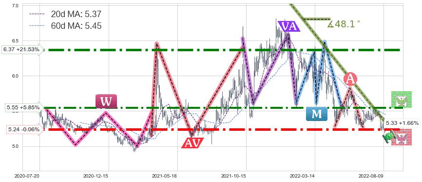 ♘ 阻力价格位5.55,可信任强度82.25%,距离最后交易2022-08-12形成的收盘价格5.24相差 +5.85%