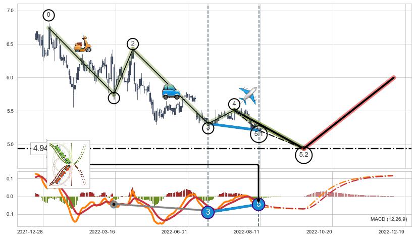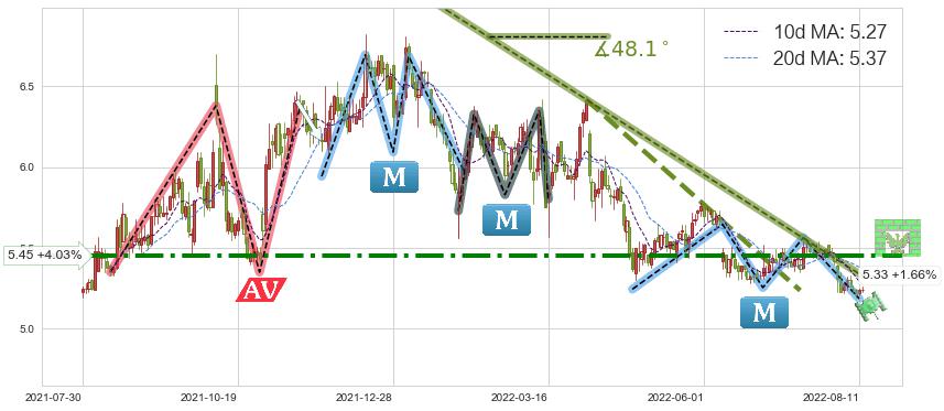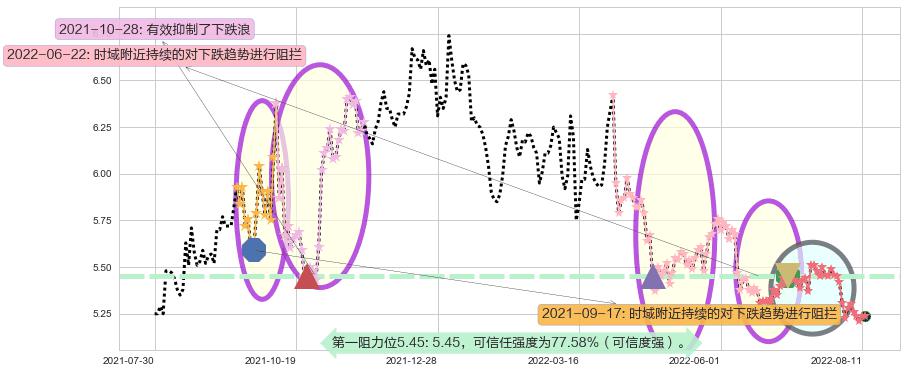 2022-06-22: 时域附近第一阻力位5.45持续的对下跌趋势进行阻拦,有效地放缓了下跌的速度。